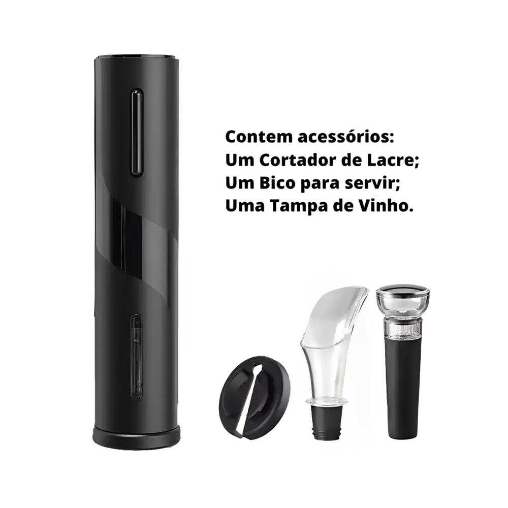 Kit Abridor de Vinhos Saca Rolhas Elétrico Automático, ideal para quem busca praticidade na hora de abrir uma garrafa de vinho. O abridor funciona de forma automática e permite abrir a garrafa em até 7 segundos, apenas pressionando um botão, sem esforço.