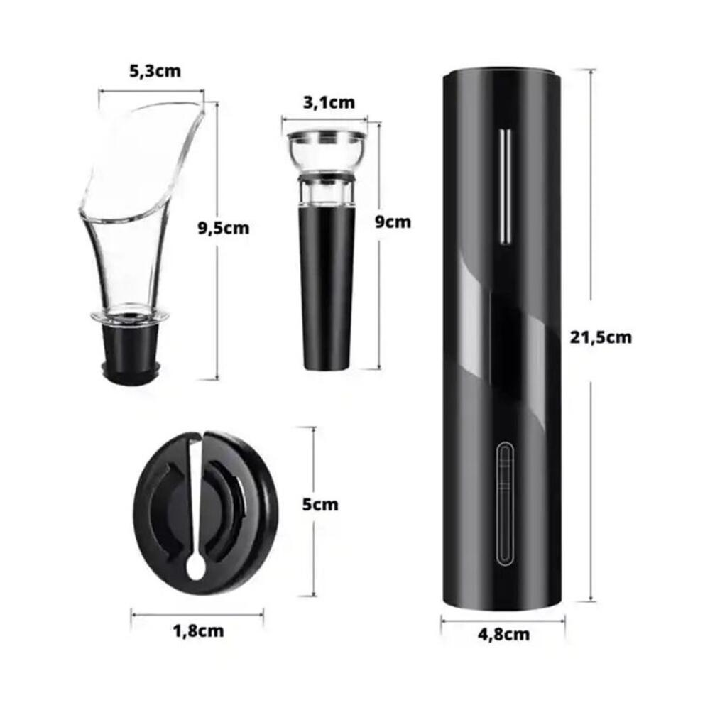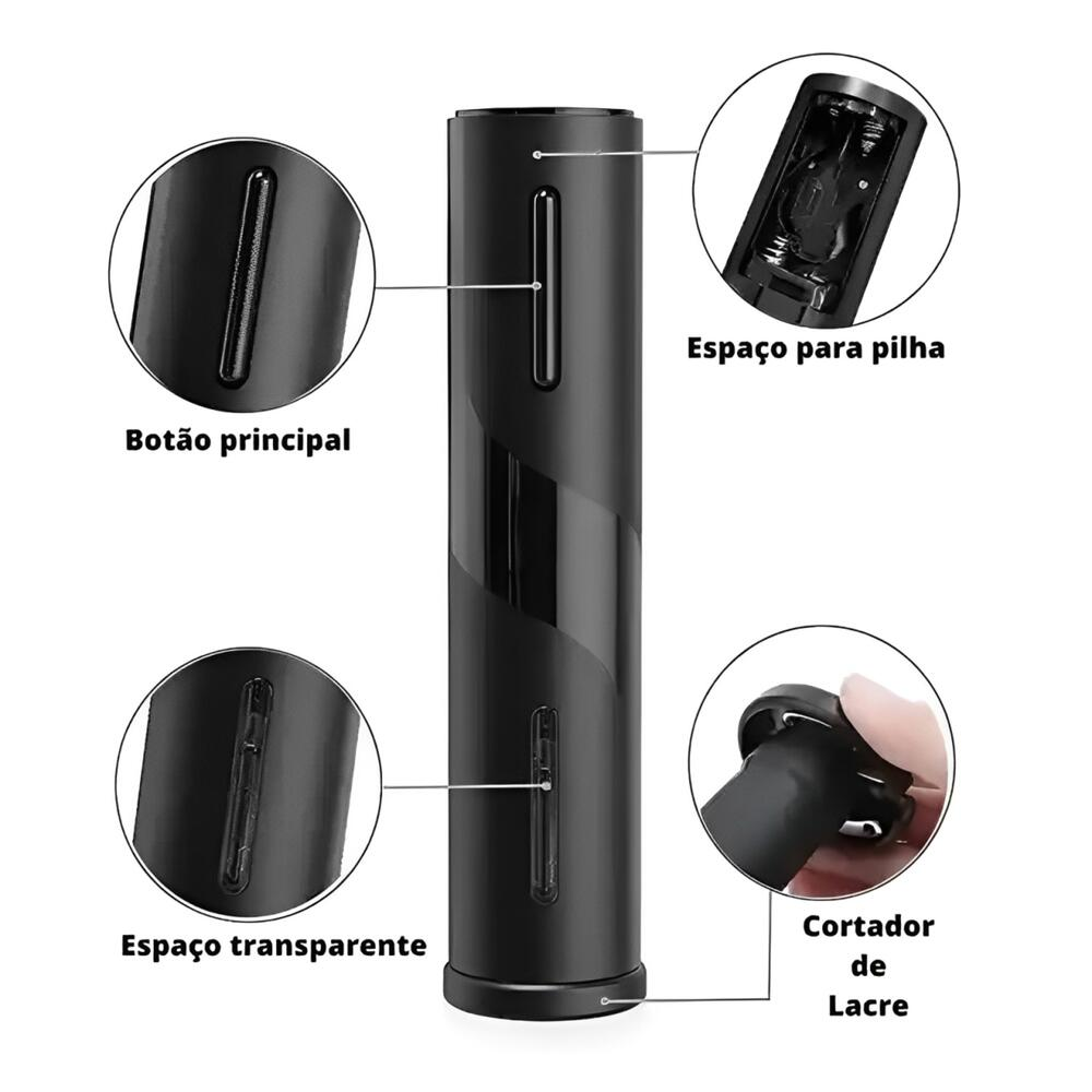 Fabricado em plástico ABS, é resistente, leve e fácil de manusear. Possui dimensões aproximadas de 21,5 x 4 cm e pesa cerca de 331 g. Funciona com 4 pilhas AA (não inclusas) e é compatível com a maioria das garrafas de vinho.