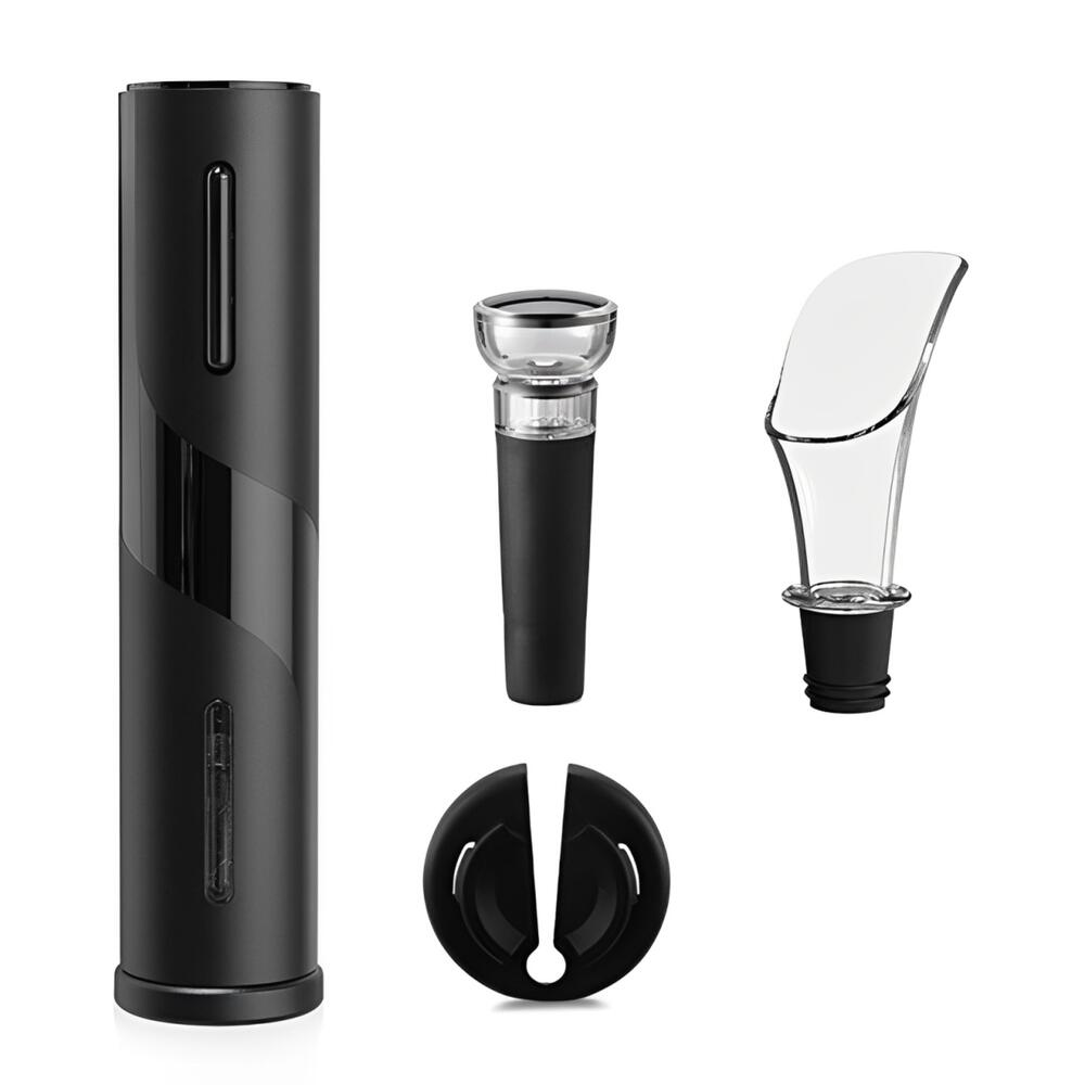 O kit acompanha acessórios que facilitam o uso no dia a dia: cortador de papel alumínio para remover o lacre da garrafa, derramador para servir o vinho sem pingar e rolha a vácuo para ajudar na conservação da bebida após aberta.