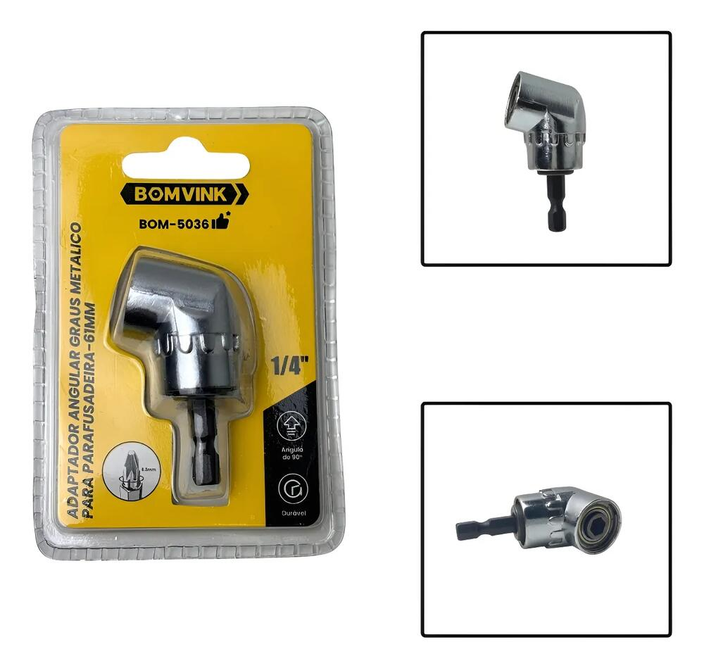 O Adaptador Angular Metálico Bomvink BOM-5036 foi desenvolvido para oferecer praticidade, precisão e resistência em trabalhos de parafusamento e perfuração em áreas estreitas ou de difícil acesso. Com ângulo de 90 graus e 61mm de comprimento, permite trabalhar com mais conforto e eficiência onde ferramentas convencionais não alcançam.