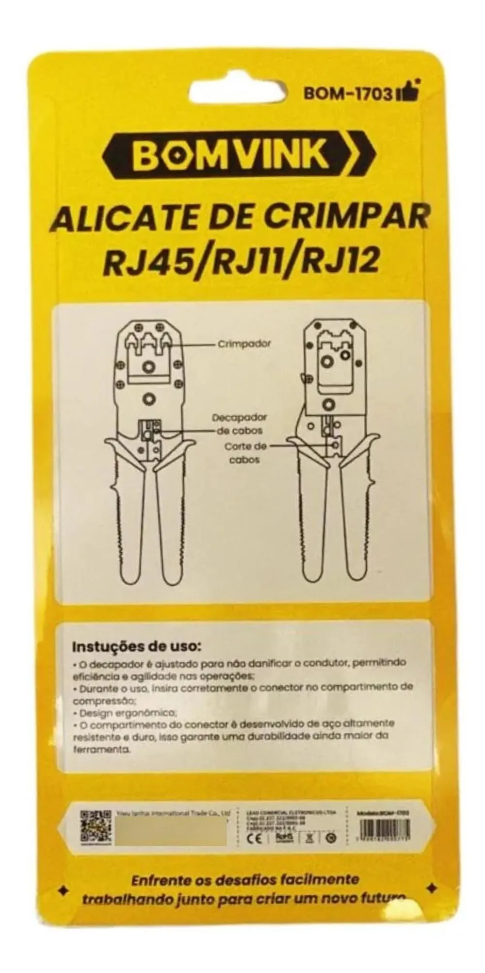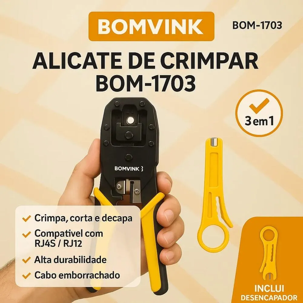 O Alicate de Crimpar Bomvink BOM-1703 foi desenvolvido para garantir precisão, eficiência e durabilidade em trabalhos de instalação e manutenção de redes de dados e telefonia. Compatível com conectores RJ45, RJ11 e RJ12, é ideal para profissionais de TI, técnicos em telecomunicações, instaladores e usuários domésticos.