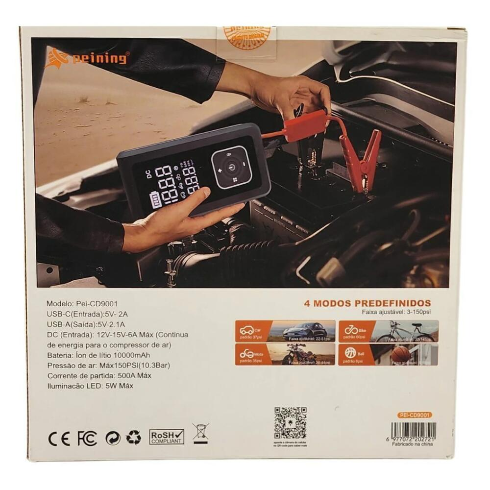 O PEINING PEI-CD9001 é um dispositivo multifuncional que combina auxiliar de partida de emergência e compressor de ar digital, garantindo segurança e praticidade em qualquer situação.
