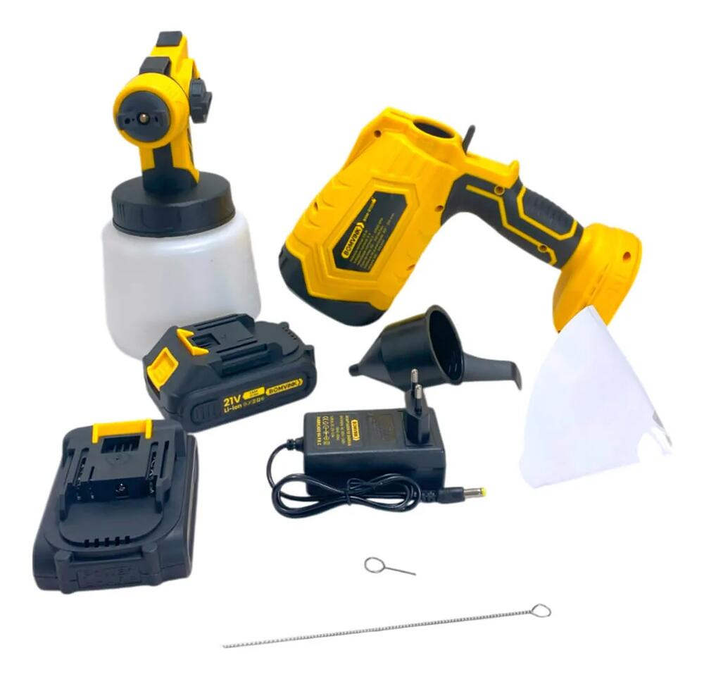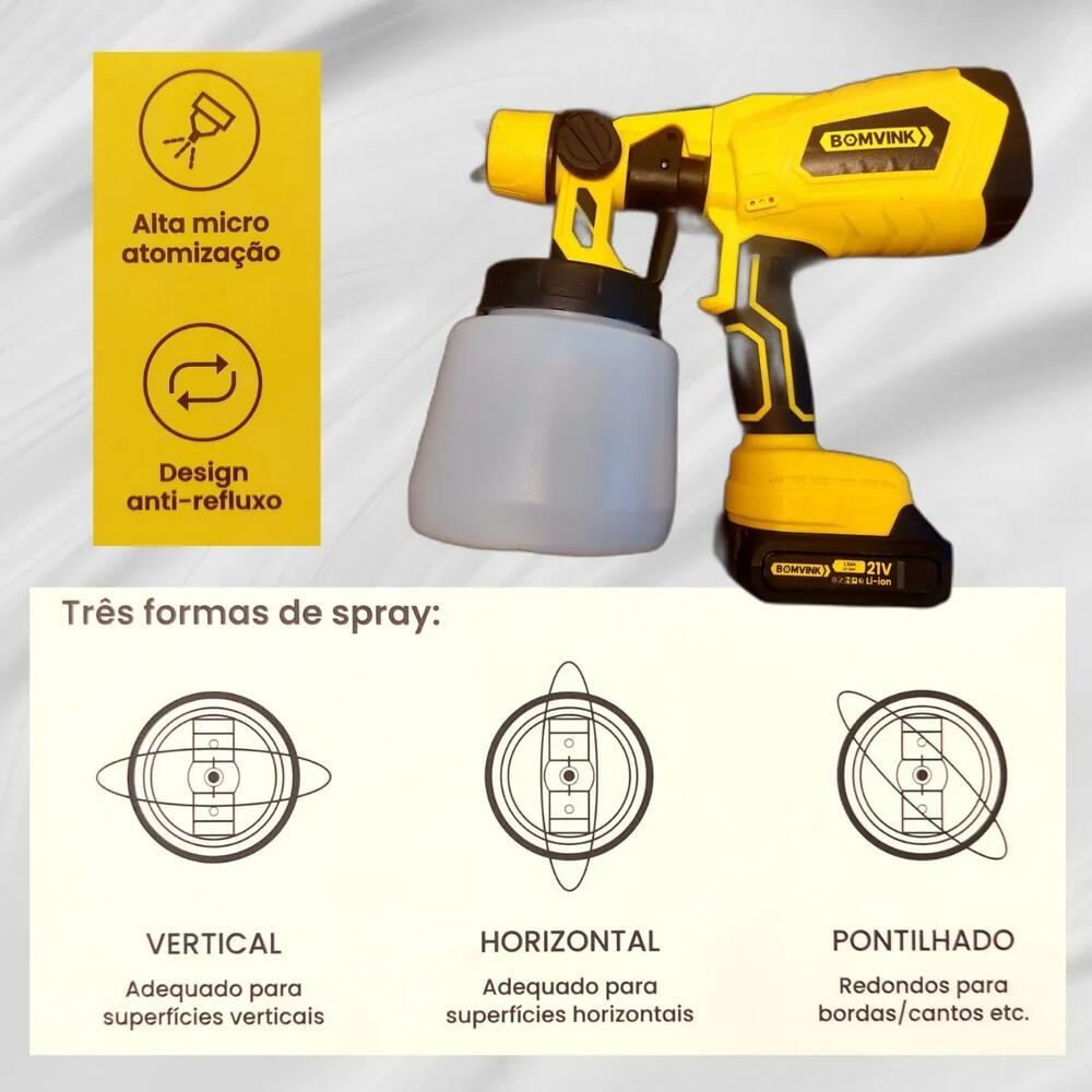 Utiliza sistema HVLP (Alto Volume e Baixa Pressão) que proporciona pulverização mais uniforme e melhor aproveitamento da tinta. Seu funcionamento sem fio com bateria de lítio 21V garante mobilidade e praticidade durante o uso.