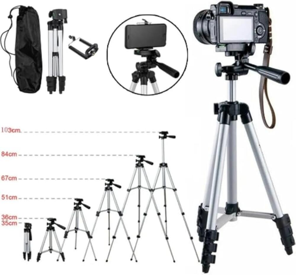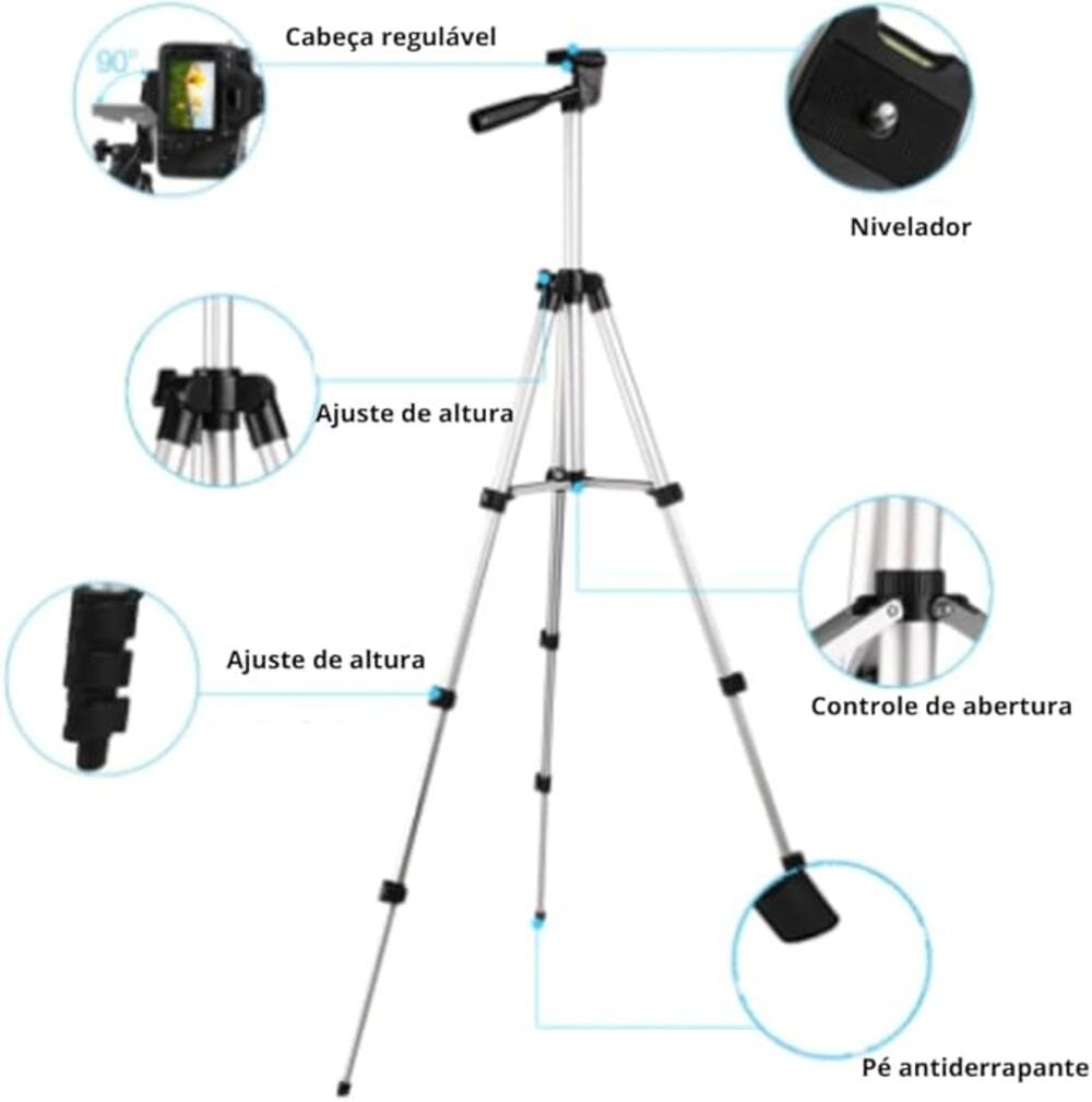 Conta com cabeça articulada, nível de bolha para melhor alinhamento e suporte para smartphone, garantindo estabilidade e versatilidade no uso. Seu design dobrável facilita o armazenamento, sendo indicado tanto para uso doméstico quanto profissional.