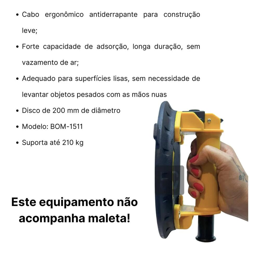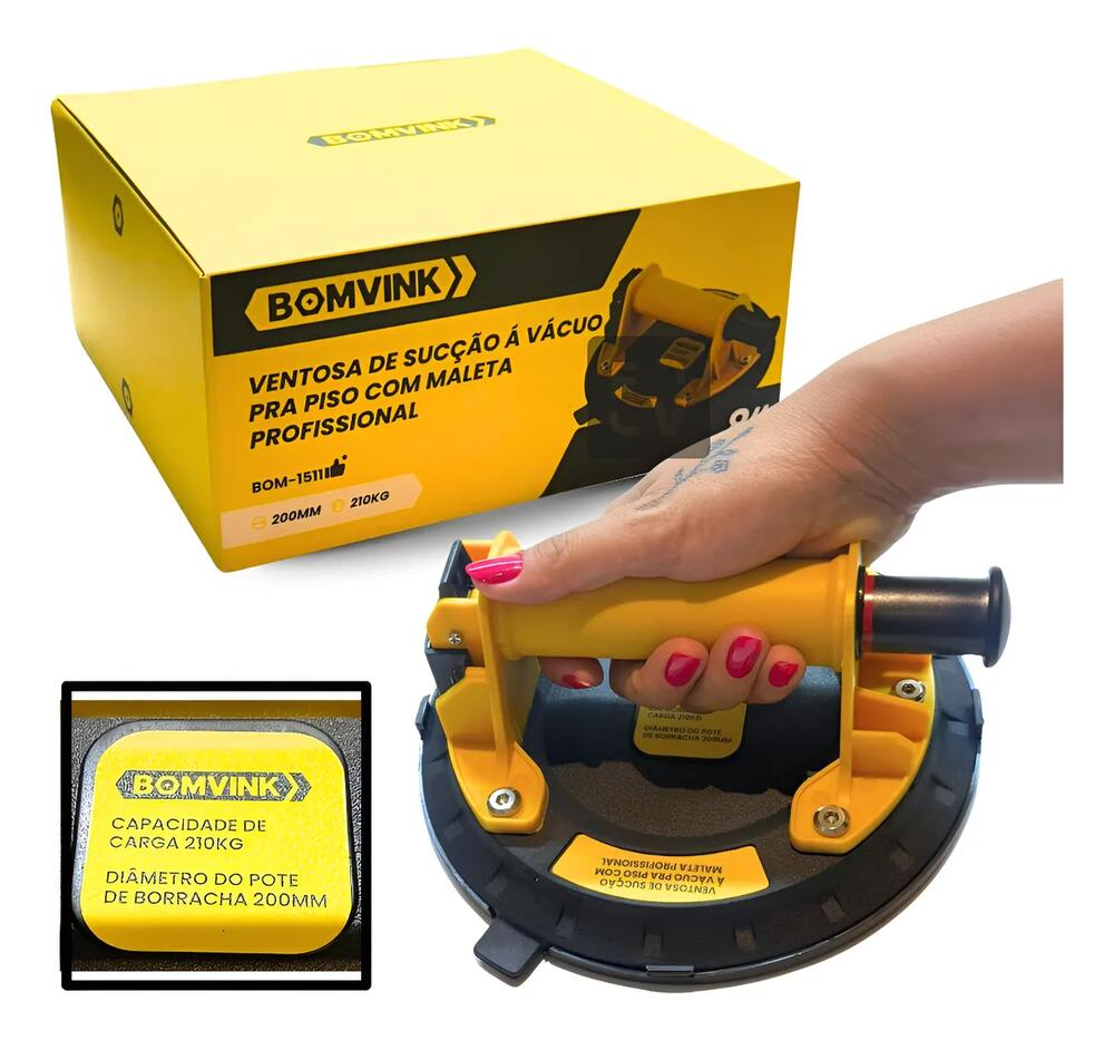 A Ventosa de Sucção a Vácuo Bomvink BOM-1511 é uma ferramenta profissional desenvolvida para elevação, movimentação e instalação de porcelanatos, pisos grandes, vidros, granitos, mármores e superfícies lisas com alta segurança e precisão.